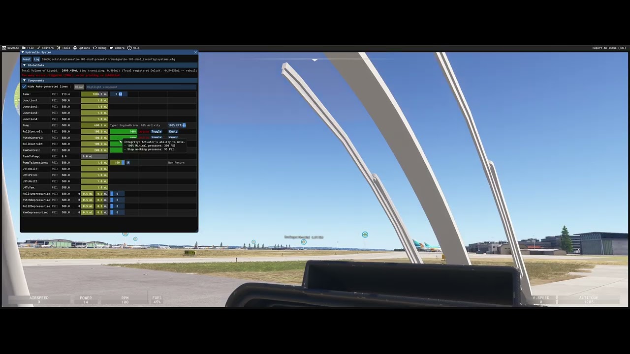 Aside from that when I use the debug options (turning the pump off etc.) to make the actuators inoperative the flight controls are still working as if nothing happened. The actuators show 0% for the integrity value but the status still says active when doing inputs. Is this intended? I would expect the flight controls to be severely impacted or completely blocked.