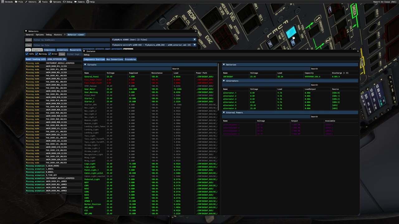 Hi, it seems like with the latest update to the SU5 Beta, events triggered with K:2:ELECTRICAL_BUS_TO_CIRCUIT_CONNECTION_TOGGLE do not seem to persist anymore. We experience this in our plane as we are unable to turn on the circuits for different components. In the eletrical debug window it can be seen that the circuit becomes powered for a fraction of a second, but then immediately switches back off.