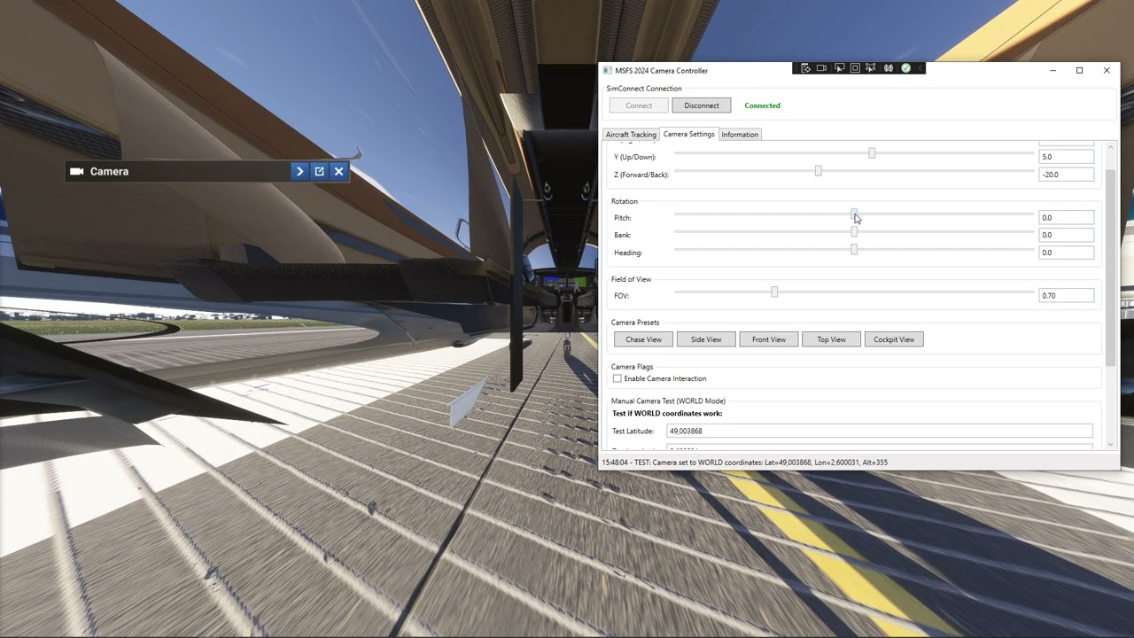 I’m calling SimConnect_CameraSet with the WORLD referential and the ALL_ROTATION mask (POSITION | ROTATION | FOV | REFERENTIAL) to move the camera to a specific lat/lon/alt position at regular intervals. A single call works perfectly. The issue appears when I send updates at a high rate.